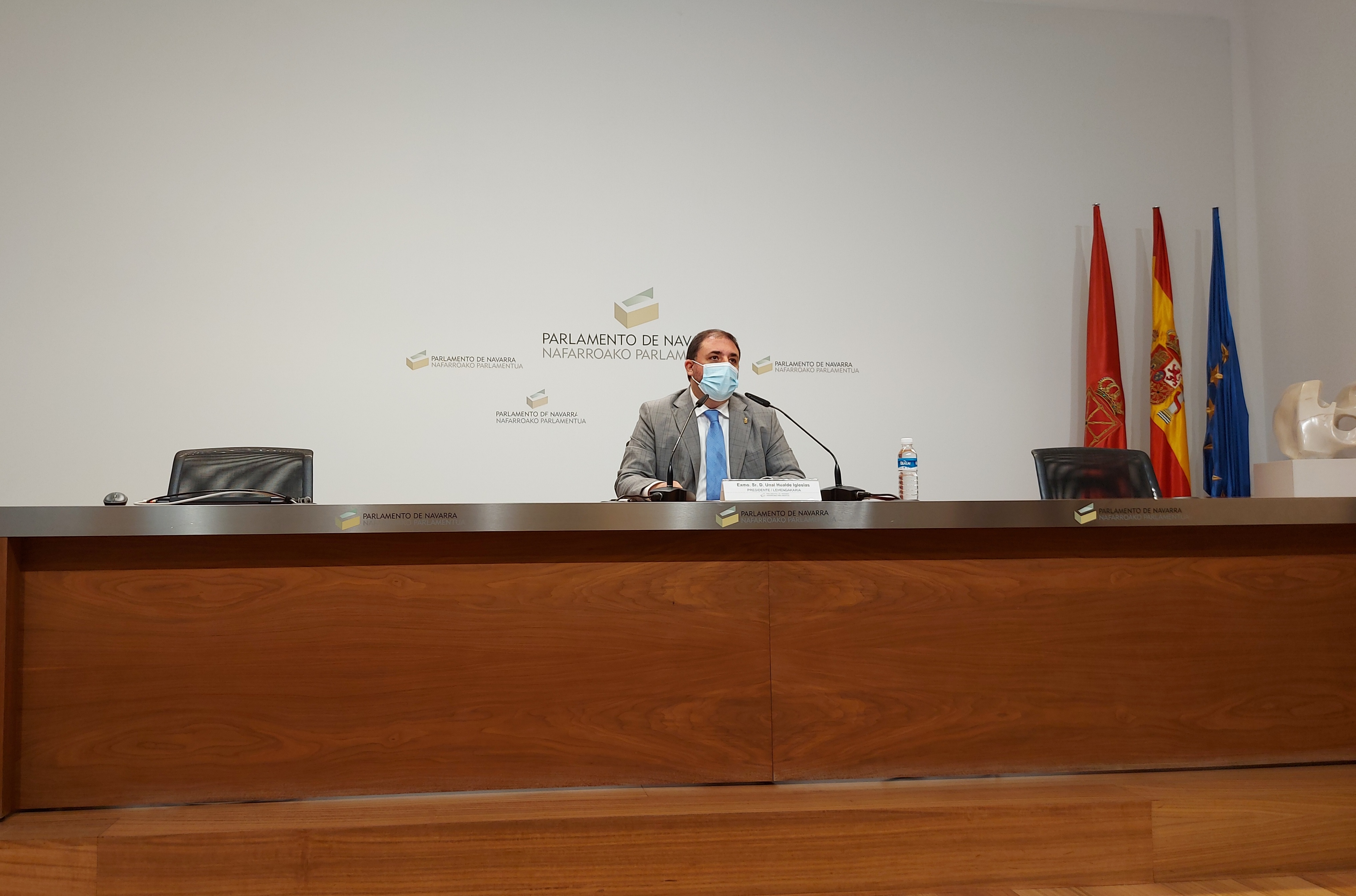 Hala nabarmendu du Nafarroako Parlamentuko presidente eta Napar Buru Batzarreko buru Unai Hualdek, Foru Ganberaren 2020-202 ekitaldiko Jardueren Memoria aurkezteko eskaini duen prentsaurrekoan.